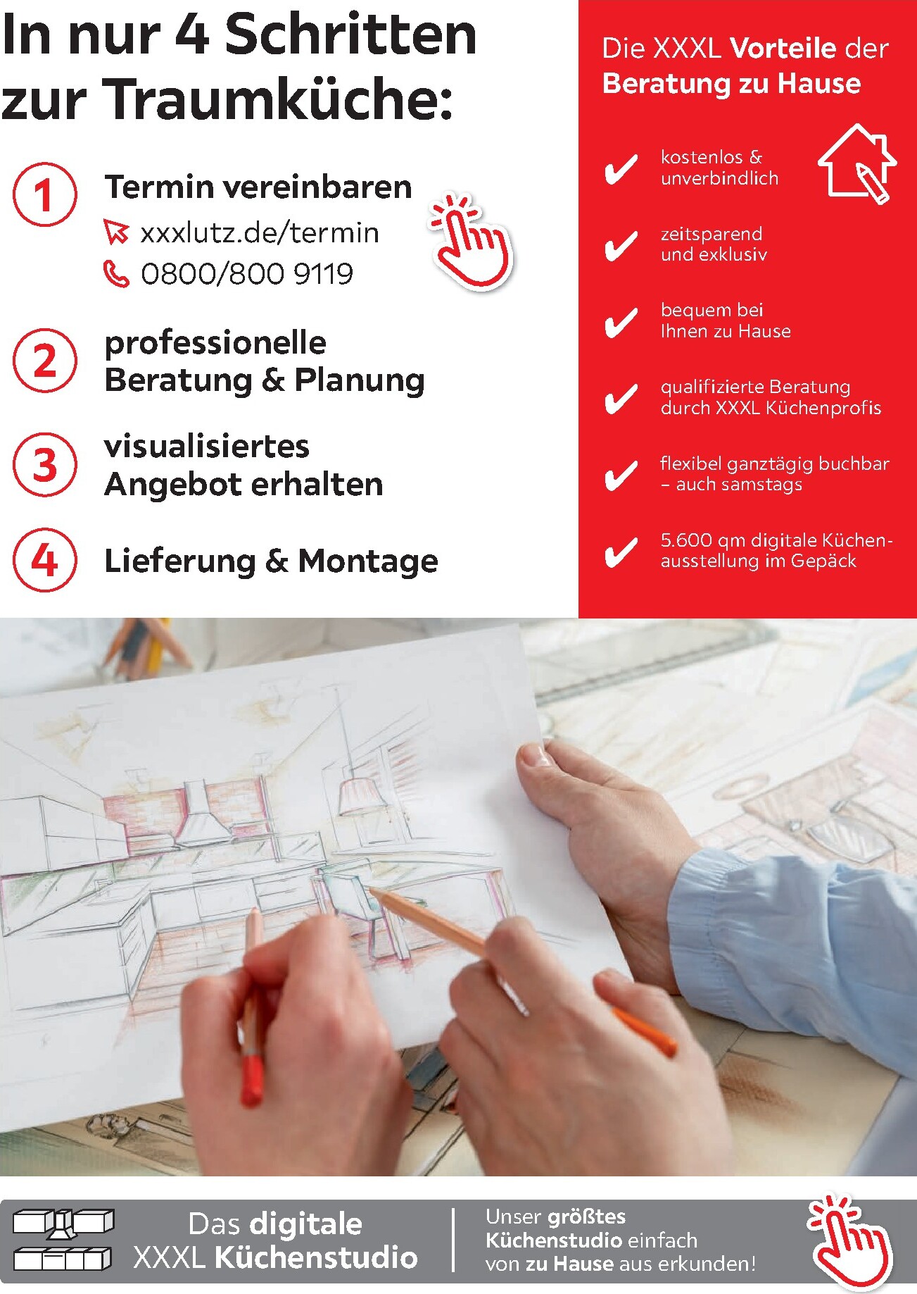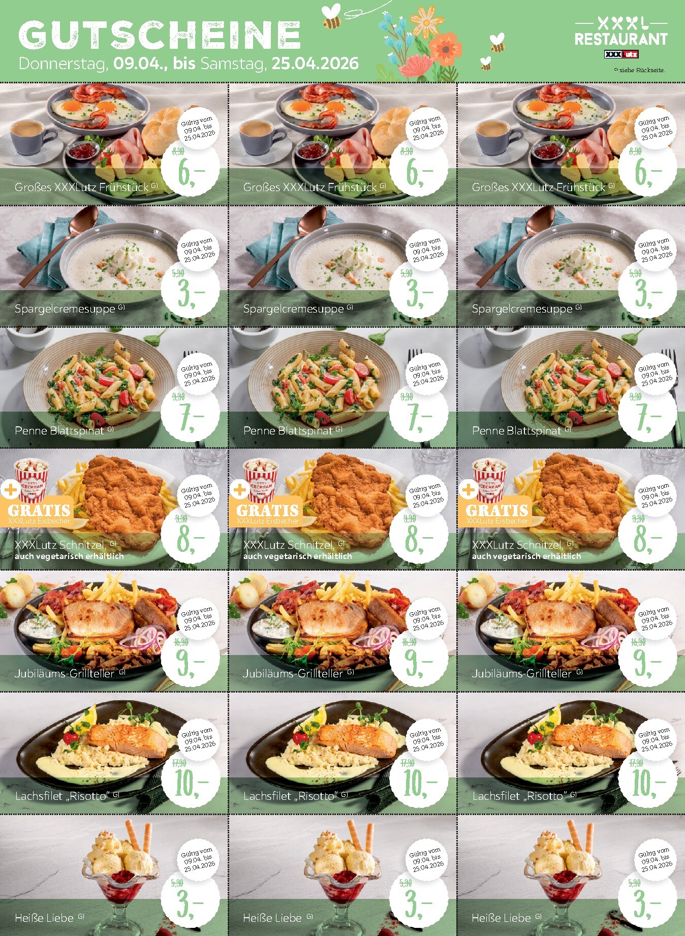 Die Gutscheinseite im Prospekt hält noch mehr Überraschungen bereit. Freuen Sie sich auf ein großes XXXLutz Frühstück für nur 6,– €, eine wärmende Spargelcremesuppe für 3,– € oder ein köstliches Lachsfilet mit Risotto für 10,– €. Auch für den süßen Zahn ist mit der „Heißen Liebe“ für 3,– € gesorgt. Werfen Sie einen Blick in das aktuelle XXXLutz Prospekt, um alle Details zu entdecken.