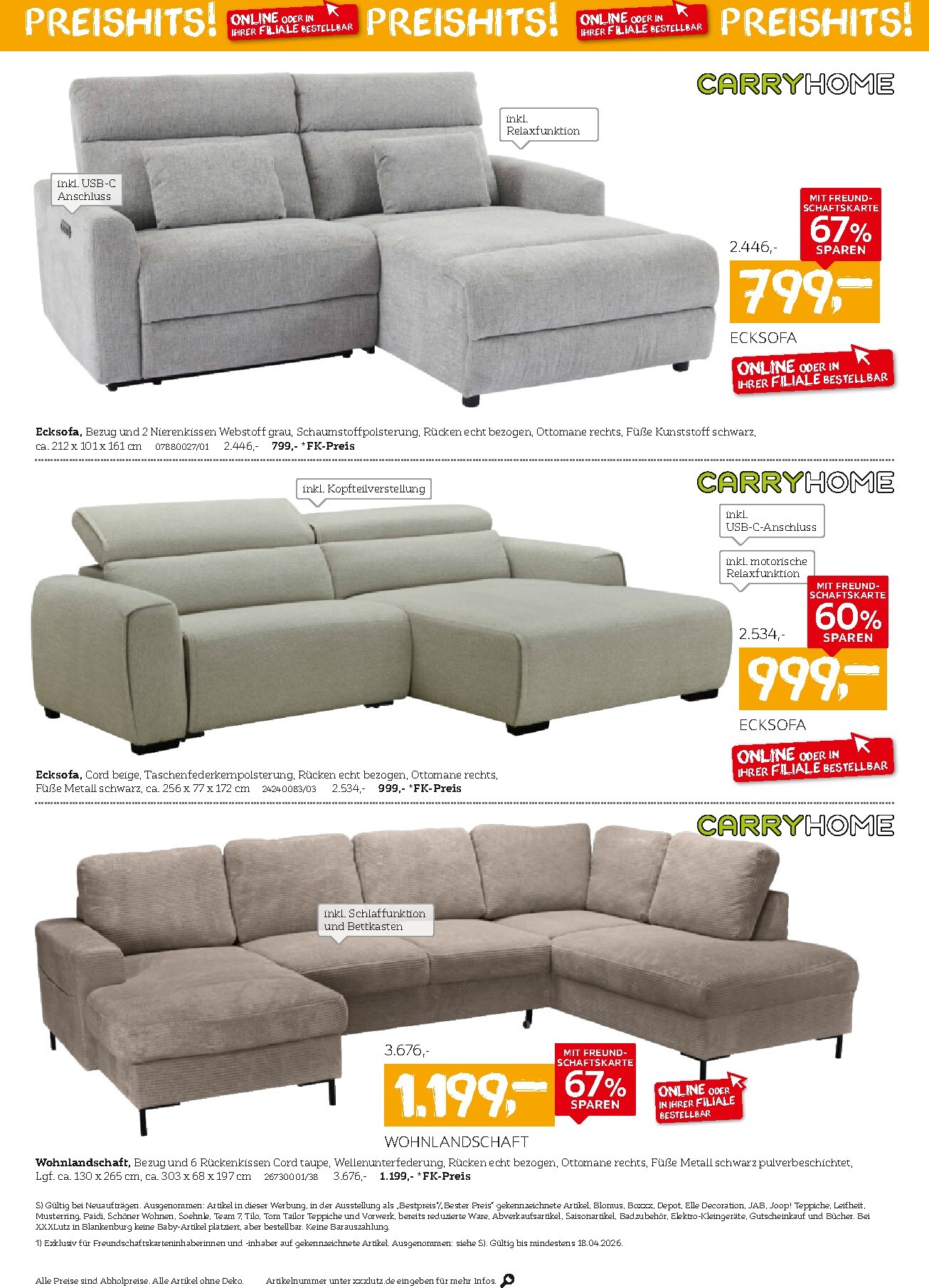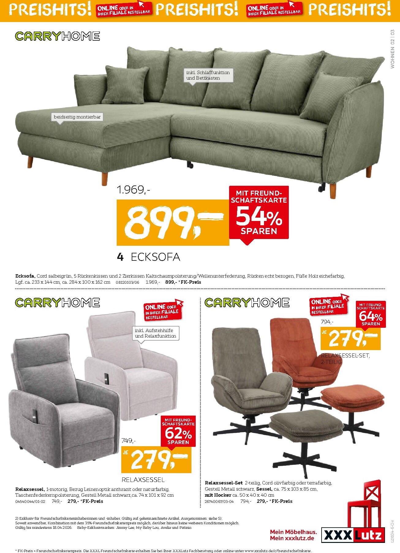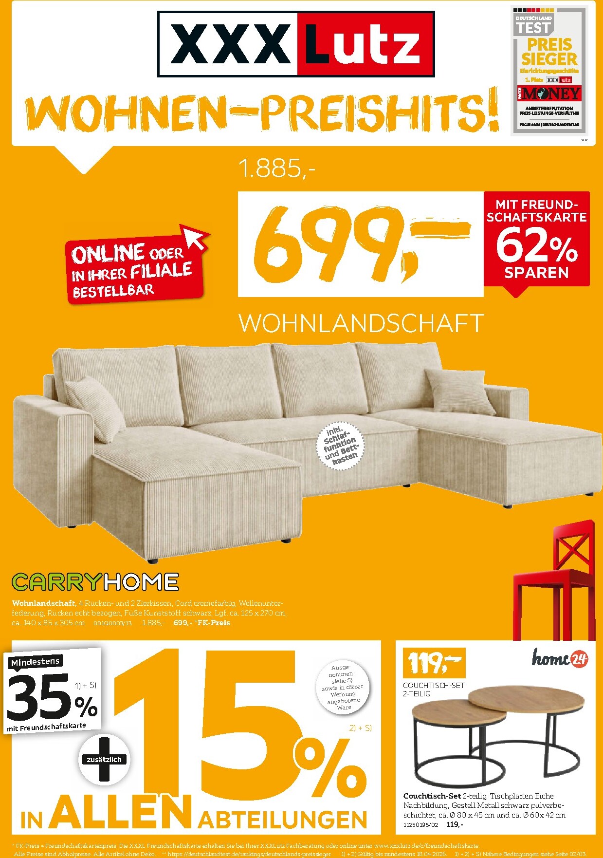 XXXLutz läutet mit den „WOHNEN-PREISHITS“ eine neue Ära des stilvollen und preiswerten Wohnens ein. Im Mittelpunkt stehen sensationelle Angebote für Ihr Wohnzimmer, die Design und Komfort vereinen. Ein absolutes Highlight ist die cremefarbige Cord-Wohnlandschaft von CARRYHOME, die mit Freundschaftskarte für nur 699 € statt 1.885 € erhältlich ist – eine Ersparnis von 62 %. Diese und viele weitere Angebote machen die XXXLutz Prospekt 18.04.2026 Werbung zu einer wahren Fundgrube für alle, die ihr Zuhause neu gestalten möchten, ohne das Budget zu sprengen. Die Vielfalt an Stilen und Funktionen lässt keine Wünsche offen.