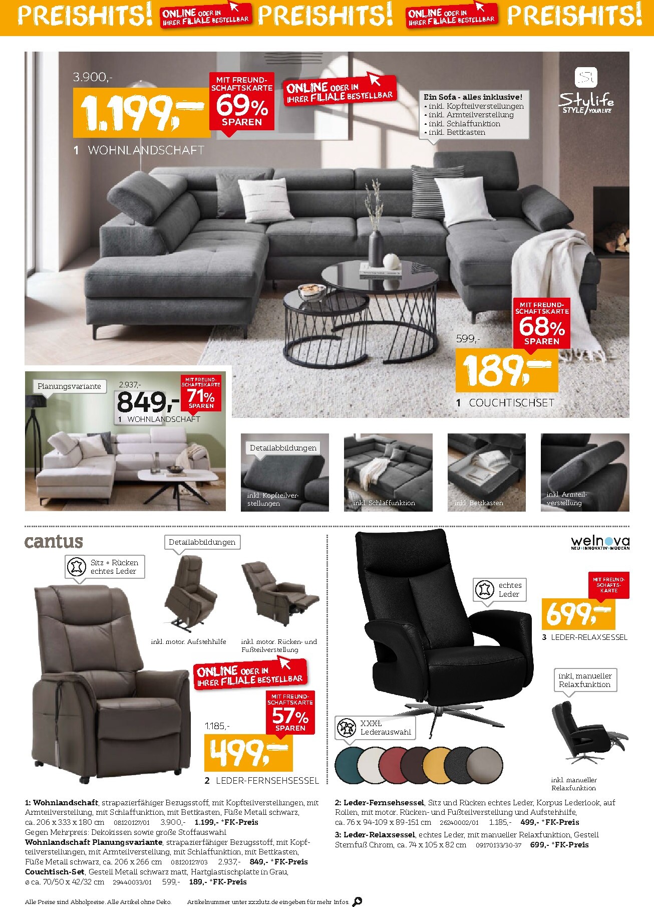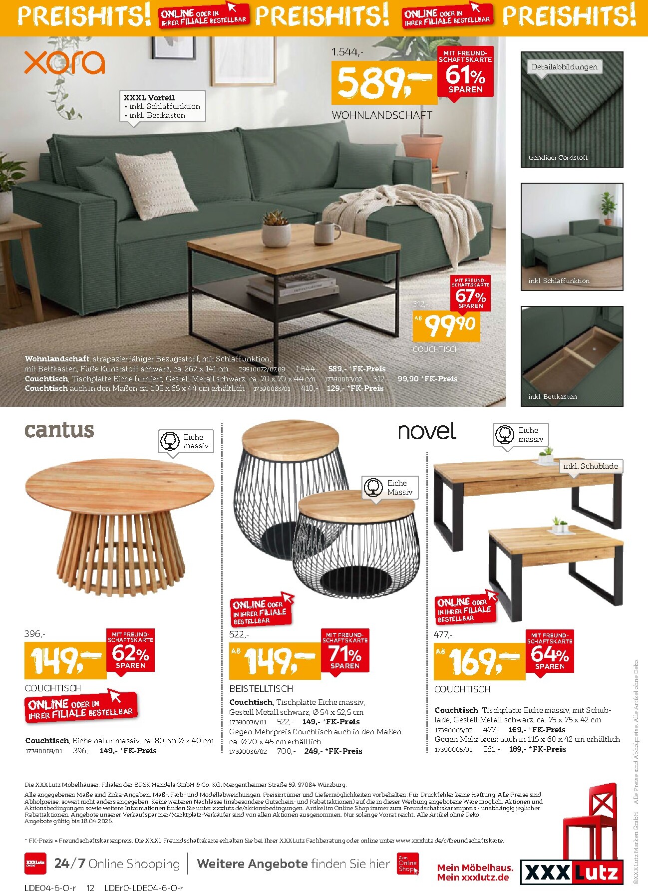 Neben den großzügigen Sofalandschaften bietet die Aktion auch eine Fülle an passenden Beimöbeln. Die XXXLutz Prospekt 18.04.2026 Werbung umfassen stilvolle Couchtische von Marken wie home24, CANTUS und NOVEL. Ob runde Tischplatten in Eiche-Optik auf schwarzem Metallgestell oder massive Tische mit praktischer Schublade – die Preise sind mit bis zu 71 % Rabatt unschlagbar günstig. Für die perfekte Entspannungsecke sorgen die Relaxsessel, die es einzeln oder als 2-teiliges Set mit Hocker schon ab 279 € gibt, was einer Ersparnis von bis zu 64 % entspricht.