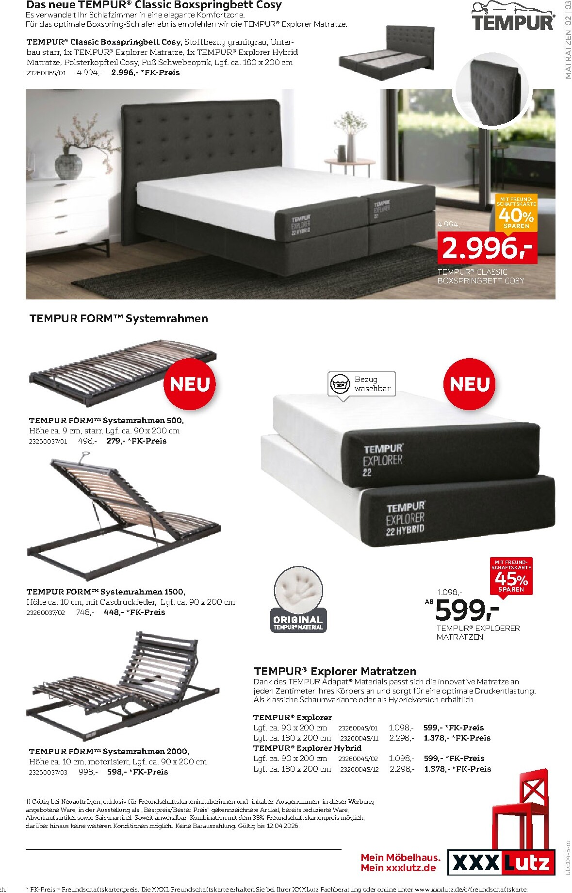 Neben Matratzen bietet XXXLutz auch komplette Schlaflösungen zu Aktionspreisen an. Das Tempur Classic Boxspringbett Cosy, ein Garant für stilvollen Komfort, ist um 40 % reduziert für 2.996 € erhältlich. Ein weiteres Highlight sind die innovativen Tempur Explorer Matratzen mit 45 % Nachlass ab 599 €. Der XXXLutz Prospekt 29.03.2026 – 12.04.2026 Angebote nächste Woche führt Sie direkt zu diesen und weiteren Angeboten wie den neuen Tempur Form™ Systemrahmen, die für eine perfekte Körperunterstützung sorgen und das Schlaferlebnis abrunden.