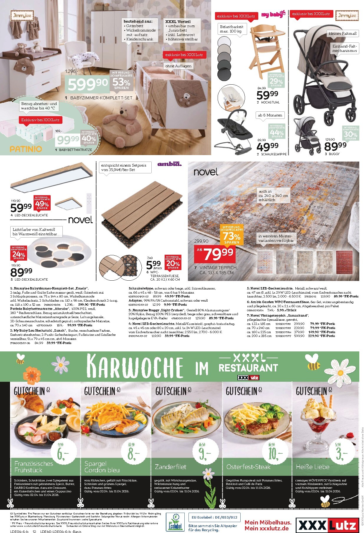 Die Rabattaktion erstreckt sich über alle Abteilungen. Für die Kleinsten gibt es komplette Babyzimmer-Sets zum halben Preis und praktische Hochstühle oder Buggys mit starken Reduzierungen. Auch Heimtextilien und Leuchten sind drastisch im Preis gesenkt, wie der stilvolle Vintage-Teppich, der mit 73 % Rabatt für nur 79,99 € angeboten wird. Nach dem erfolgreichen Einkauf können Sie sich im XXXLutz Restaurant mit kulinarischen Angeboten wie dem Osterfest-Steak für 10 € stärken. Alle Details zu diesen und vielen weiteren Angeboten finden Sie im aktuellen XXXLutz Prospekt.