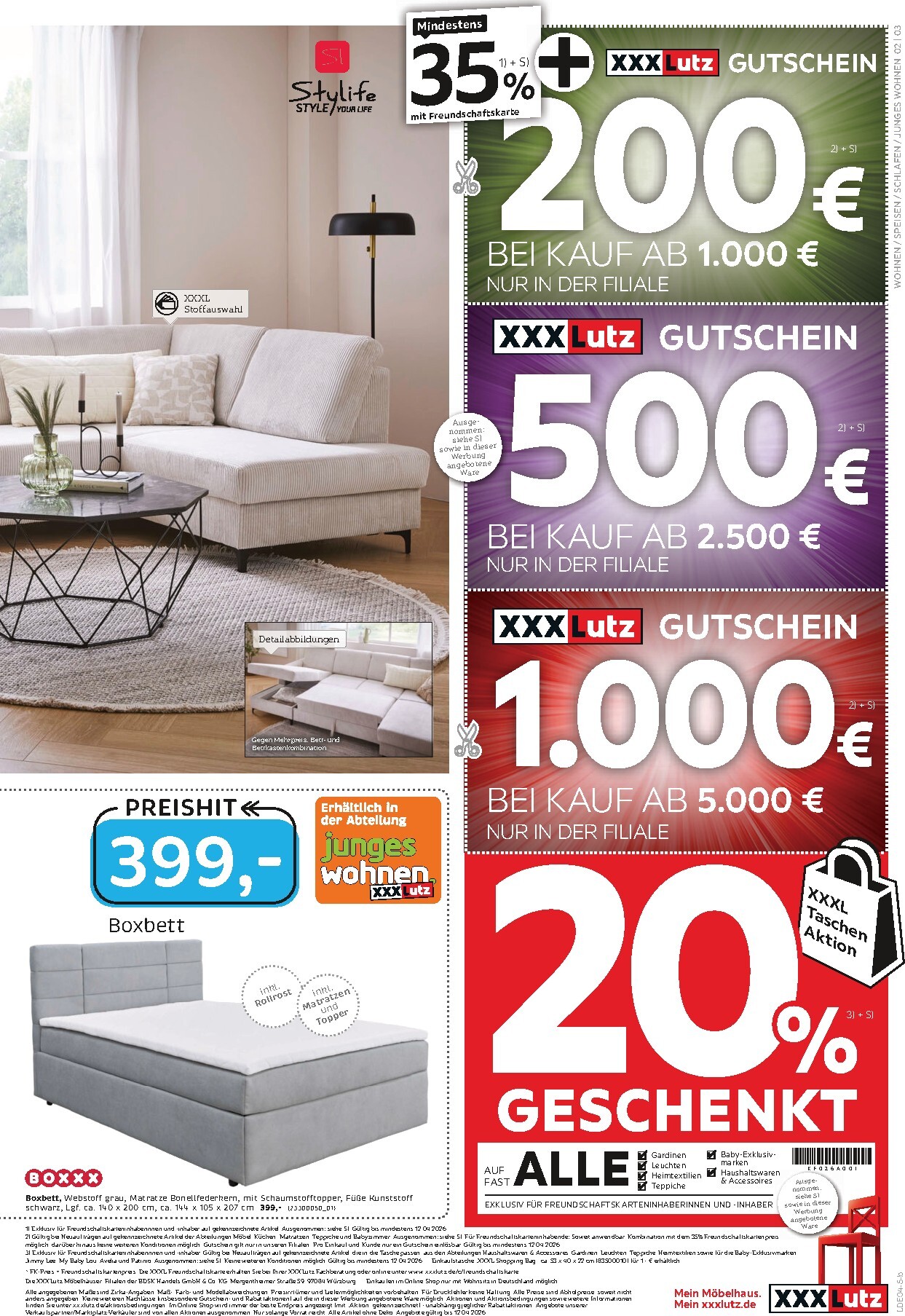 Neben den direkten Preisnachlässen können Sie im Rahmen der XXXLutz Prospekt 29.03.2026 – 12.04.2026 zum Blättern zusätzlich sparen. Mit den XXXLutz Gutscheinen sichern Sie sich je nach Einkaufswert einen Bonus von bis zu 1.000 €. Bei einem Einkauf ab 1.000 € erhalten Sie einen 200-€-Gutschein, ab 2.500 € sind es sogar 500 € und ab 5.000 € ein ganzer 1.000-€-Gutschein. Für Inhaber der Freundschaftskarte gibt es mindestens 35 % Rabatt auf viele Artikel. Eine weitere Sparmöglichkeit ist die „XXXL Taschen Aktion“, bei der Sie 20 % auf fast alle Artikel erhalten, die in die Tasche passen, was besonders bei Heimtextilien und Dekoration attraktiv ist.