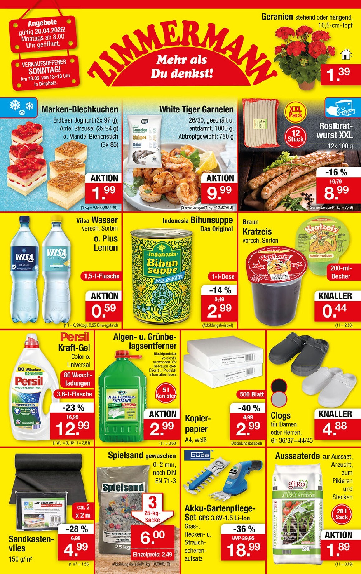 Die neue Woche bei Zimmermann startet mit einer Fülle an sensationellen Angeboten, die vom 20. bis zum 25. April 2026 gültig sind. Ob für den Garten, die nächste Grillparty oder den Wocheneinkauf – hier wird jeder fündig. Ein besonderes Highlight für alle Pflanzenfreunde sind die stehenden oder hängenden Geranien für nur 1,39 €. Perfekt für den Start in die Grillsaison ist die XXL-Packung Rostbratwurst mit 12 Stück für unschlagbare 8,99 €. Wer auf der Suche nach Zimmermann Prospekt 20.04.2026 – 25.04.2026 Angebote Angebote zum Blättern ist, wird von der Vielfalt und den Preisen begeistert sein. Auch für den Haushalt gibt es Top-Deals, wie zum Beispiel die 80-Waschladungen-Packung Persil Kraft-Gel für nur 12,99 €, was eine Ersparnis von 23 % bedeutet.