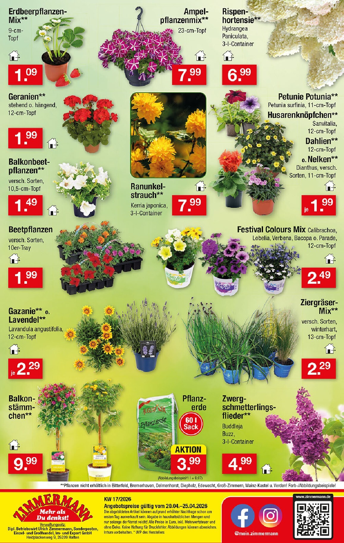 Der Frühling hält Einzug mit einer riesigen Auswahl an Pflanzen zu unschlagbaren Preisen. Verschönern Sie Ihren Balkon oder Garten mit Erdbeerpflanzen für 1,09 €, prächtigen Ampelpflanzen für 7,99 € oder edlen Rispenhortensien für 6,99 €. Passend dazu gibt es 60 Liter Pflanzerde für nur 3,99 €. Ein weiteres Highlight ist der Zwerg-Schmetterlingsflieder für 4,99 €, der Insekten anlockt und für ein lebendiges Gartenambiente sorgt. Verpassen Sie diese und viele weitere Angebote nicht und entdecken Sie alle Schnäppchen im aktuellen Zimmermann Prospekt.