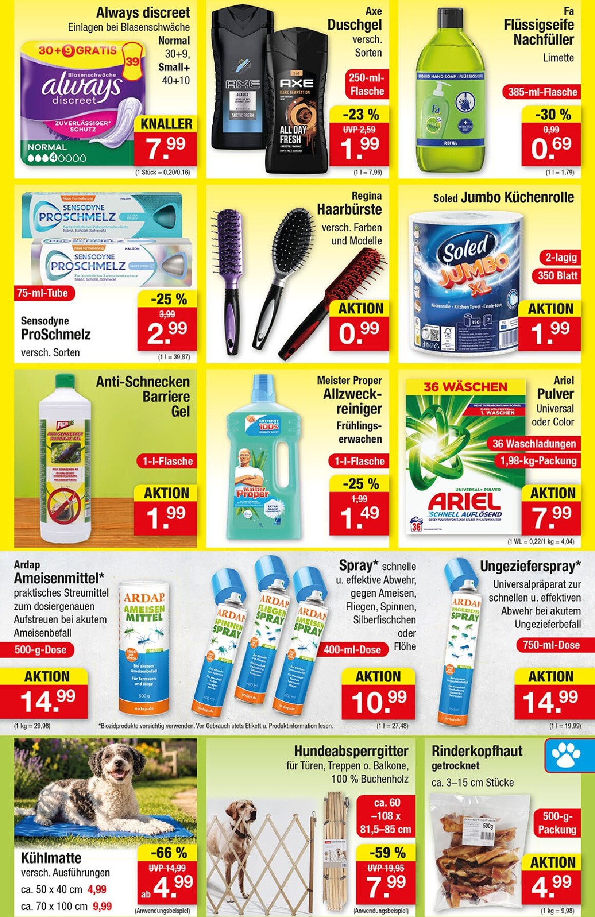 Neben Lebensmitteln bietet der Prospekt auch zahlreiche Artikel für die persönliche Pflege und einen sauberen Haushalt. So gibt es zum Beispiel das Axe Duschgel in verschiedenen Sorten für nur 1,99 € oder die Sensodyne ProSchmelz Zahnpasta für 2,99 €. Für strahlende Sauberkeit sorgt der Meister Proper Allzweckreiniger für 1,49 € und das Ariel Pulver für 36 Wäschen zum Preis von 7,99 €. Die aktuellen Zimmermann Prospekt 20.04.2026 – 25.04.2026 Angebote Angebote zum Blättern umfassen auch eine breite Palette an Produkten für den Garten, die den grünen Daumen höherschlagen lassen und das eigene Zuhause in eine blühende Oase verwandeln.